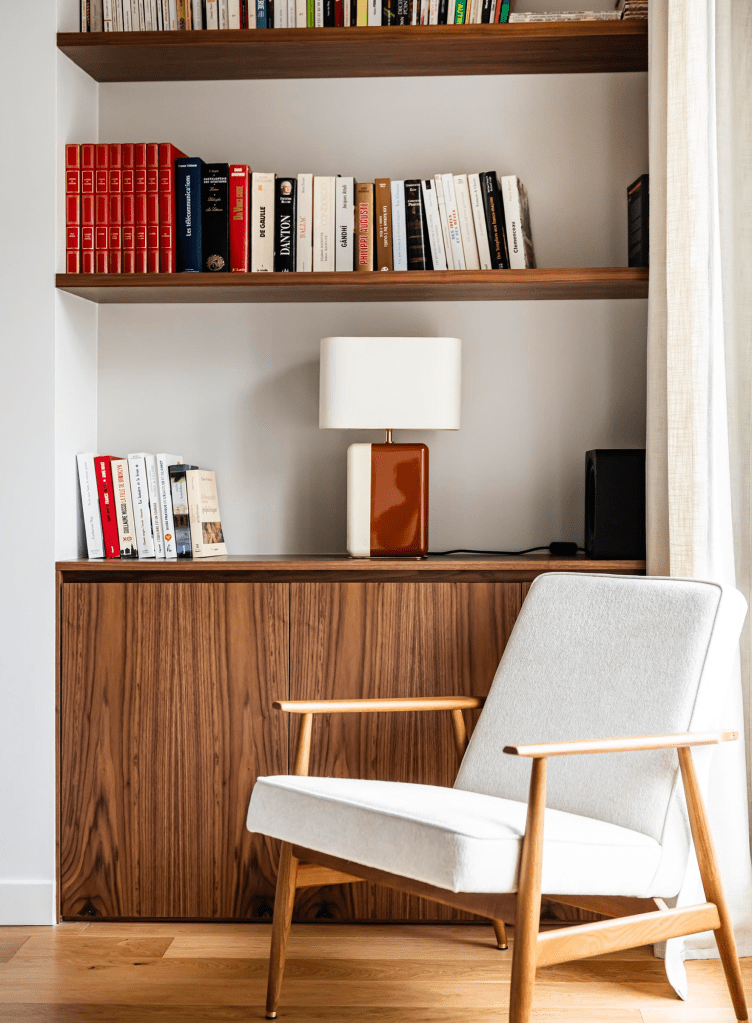 Une fois le claustra sur-mesure installé, il a fallu intégrer des éléments de mobilier et de décoration à la pièce. C’est à ce moment du projet que la collaboration avec Eben Home a pris tout son sens. Marine voulait jouer sur des matériaux élégants comme le marbre, le coton et le bois. Le fauteuil Fox de chez 366 Concept a été tout de suite un véritable coup de coeur, il correspondait parfaitement à ce qu’elle visualisait pour venir habiller l’espace où se situe la niche encastrée. Une vraie touche d’élégance et de vintage mélangés.