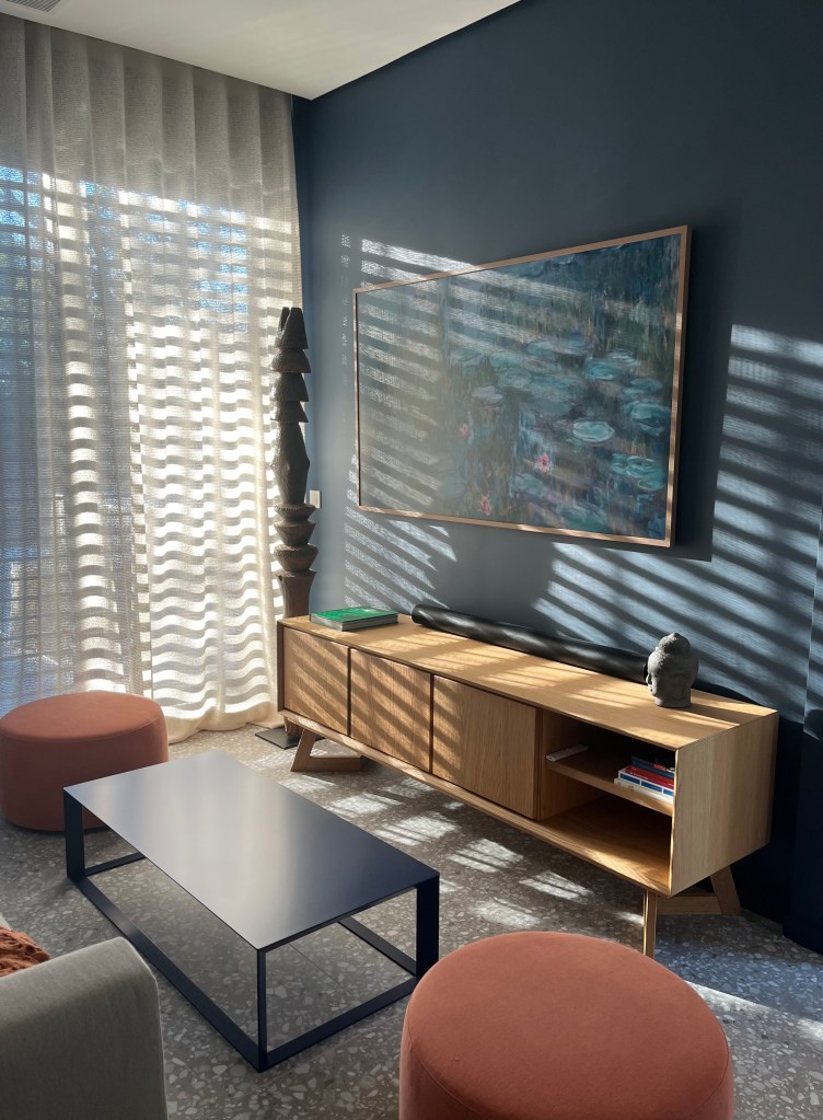 Dans le salon, la table basse Frame 3 – Bleu Navy de chez Même Design apporte une touche de dynamisme qui vient contrebalancer la douceur des poufs Depart de chez Joquer, sélectionnés avec des tissus pastel. Cette association crée un équilibre entre énergie et sérénité tout en préservant une atmosphère harmonieuse.